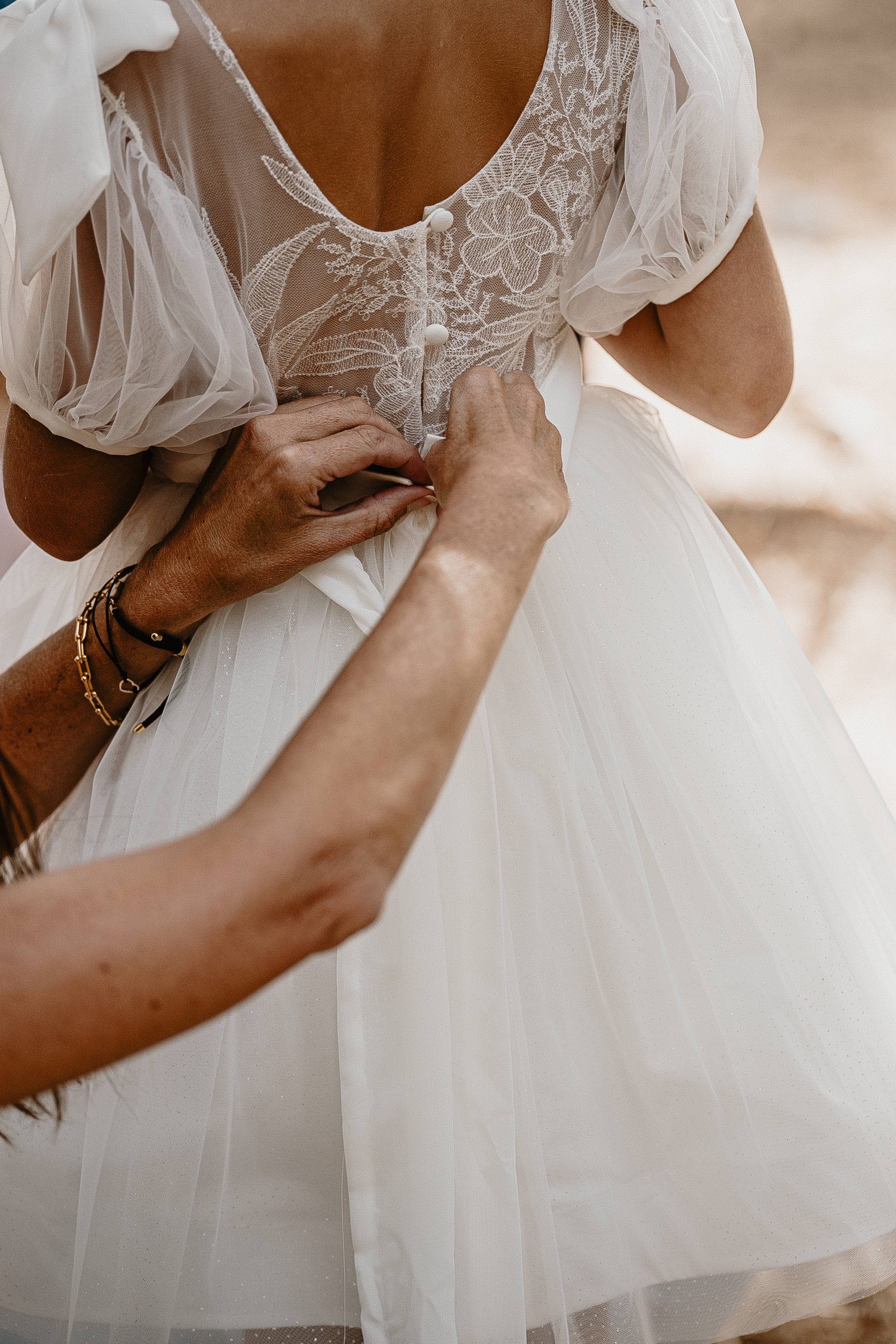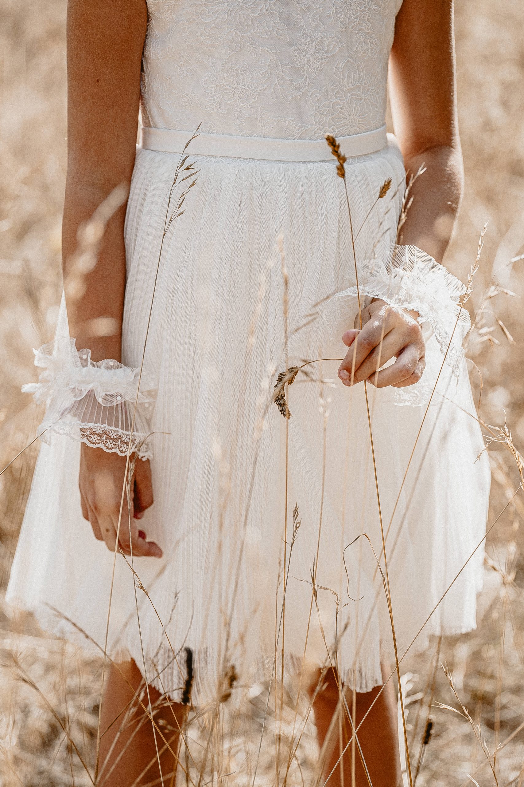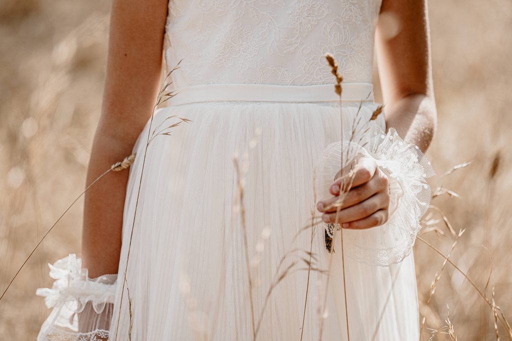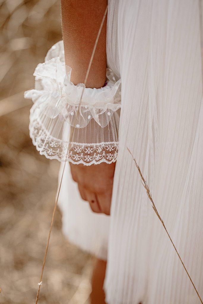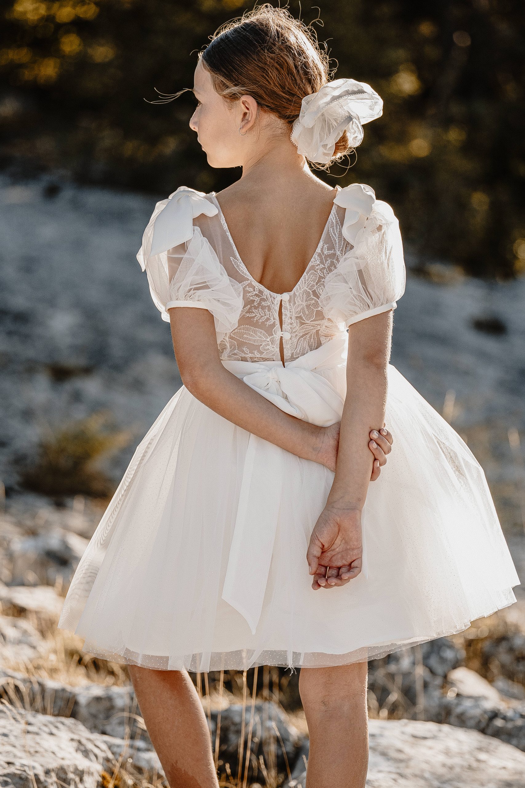 Magnifique robe romantique avec ses manches bouffantes en tulle et ses petits détails aux poignets.