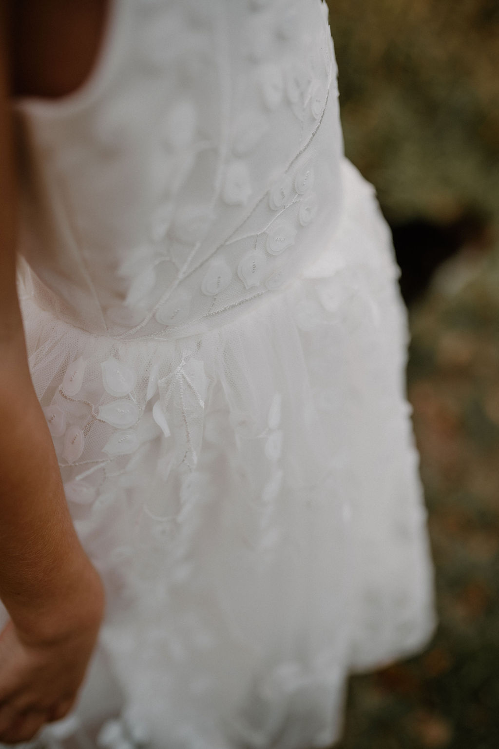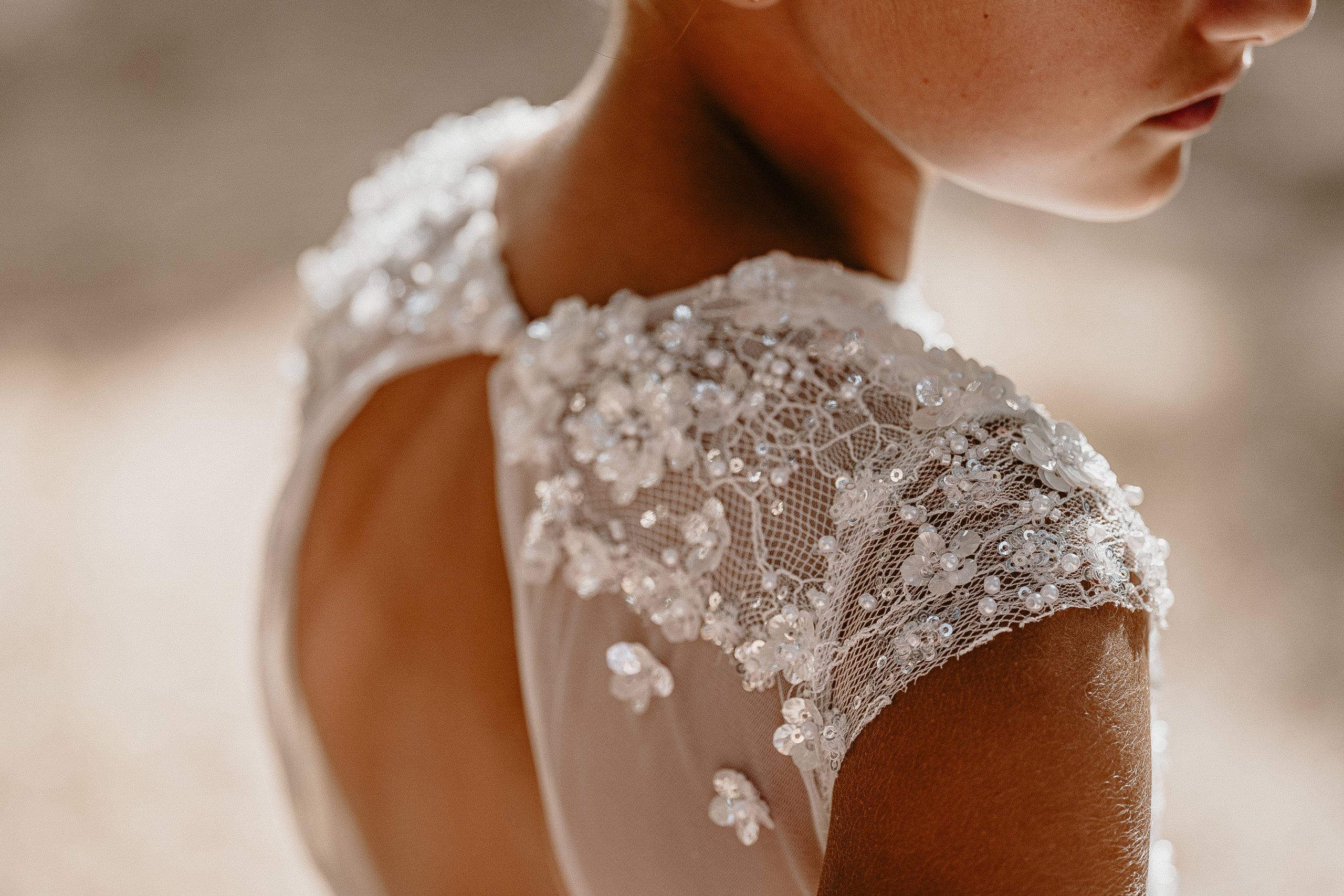 Une robe absolument magnifique avec sa dentelle feuillages et sequins et son tulle pailleté argenté tout en discrétion.