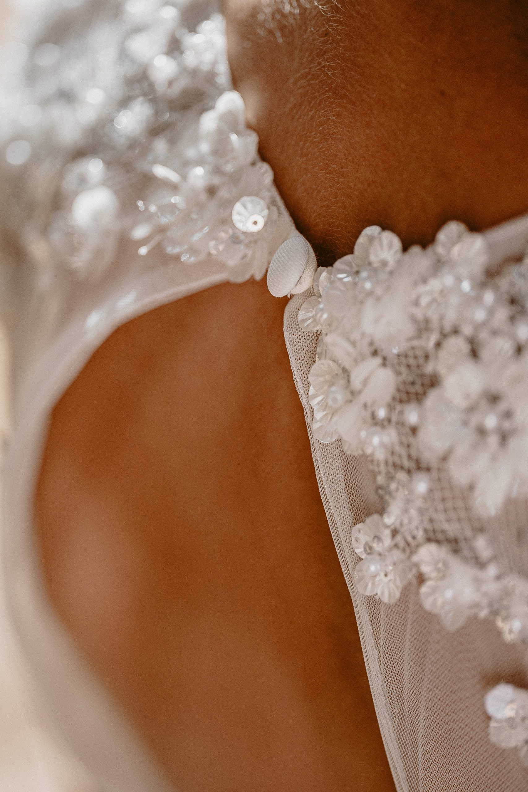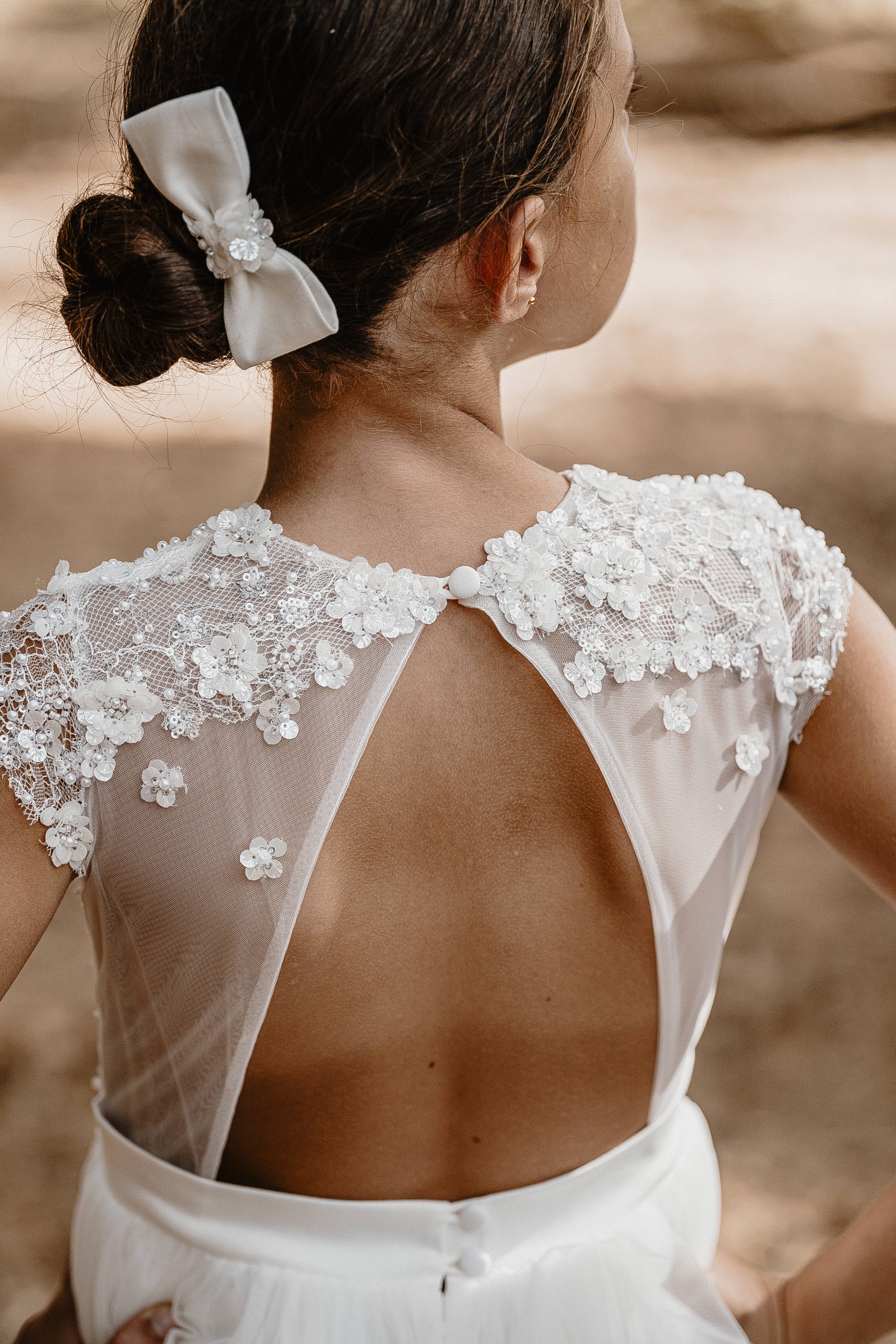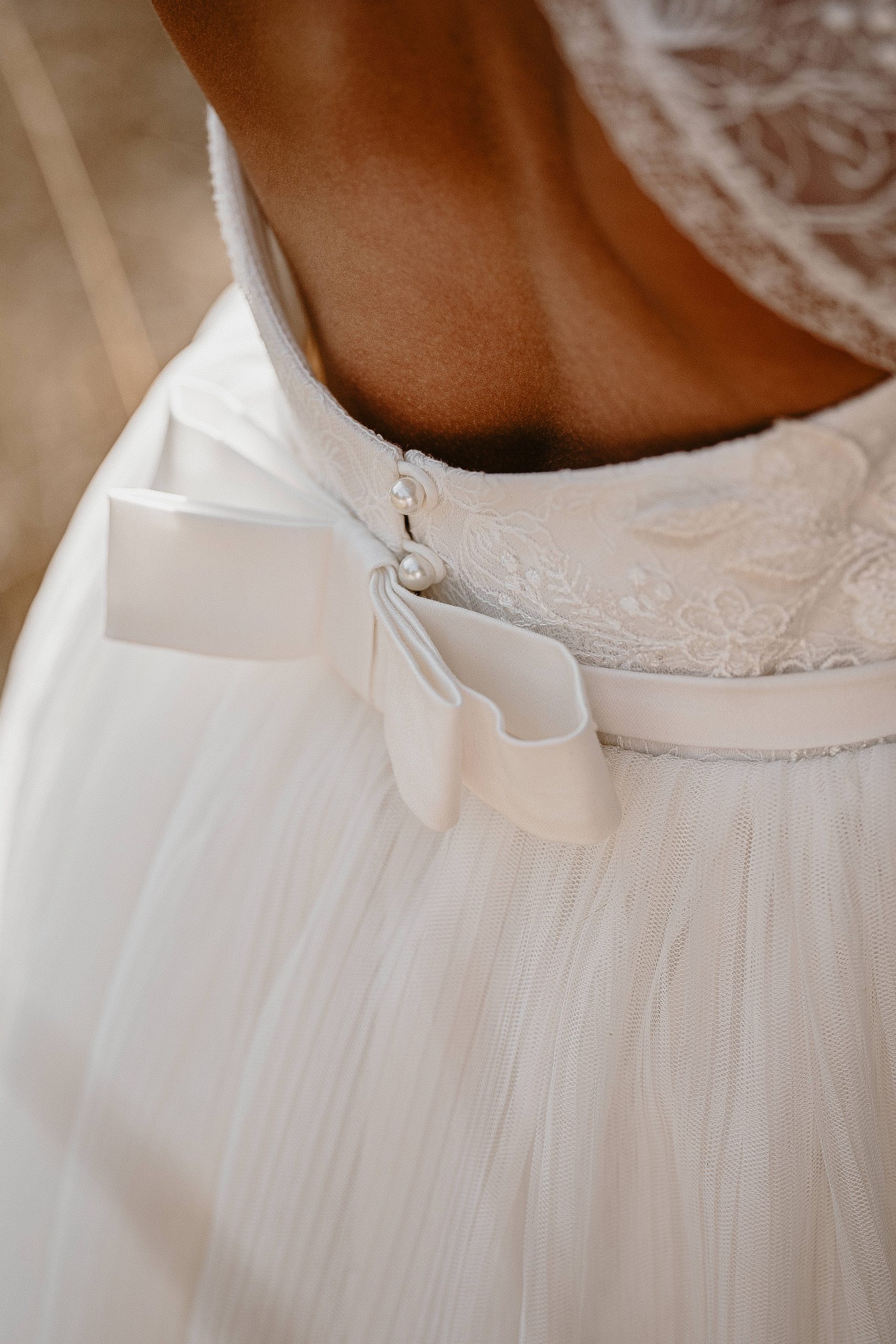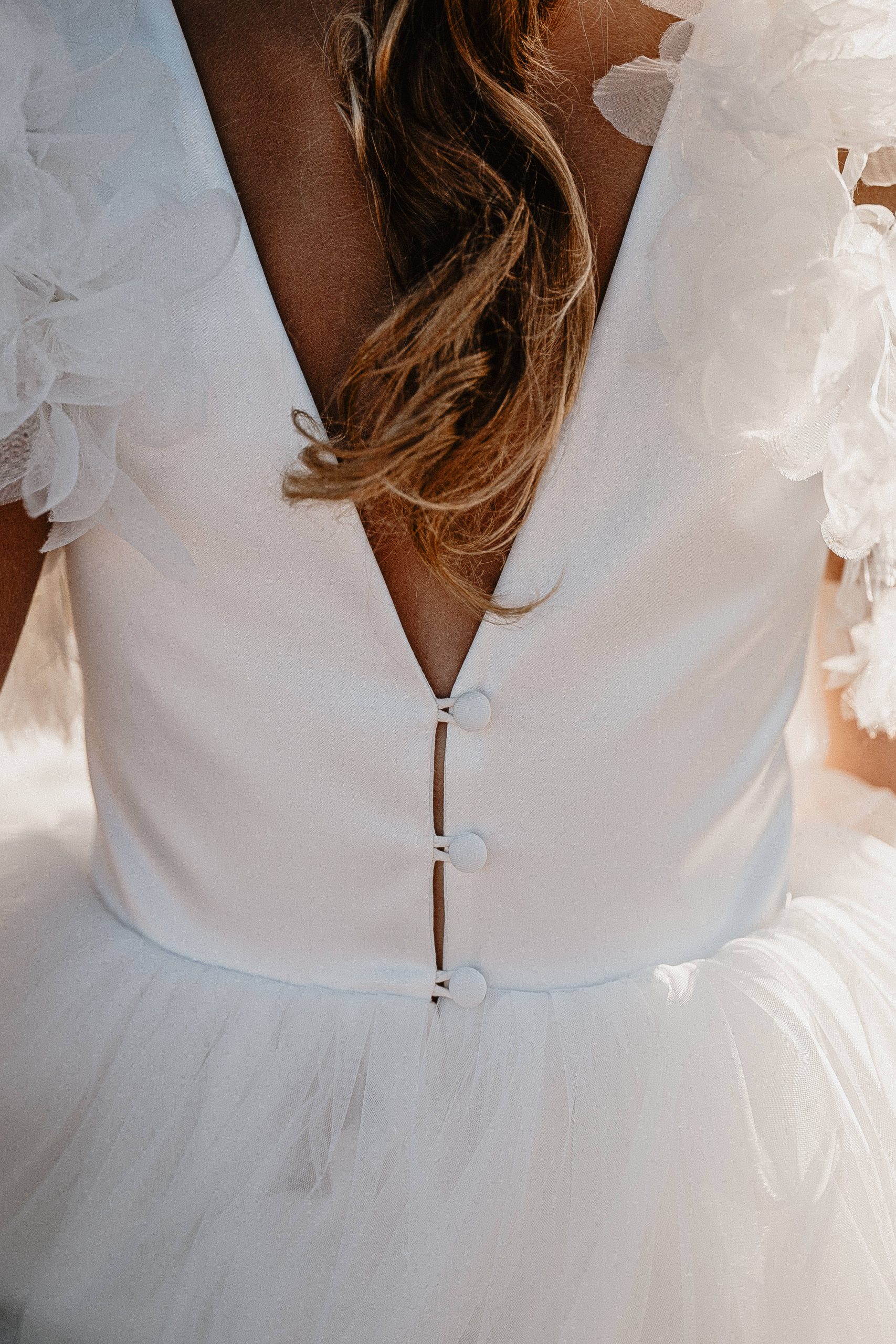 Le dos est en V sur satin blanc cassé, fermé avec des brides et boutons.