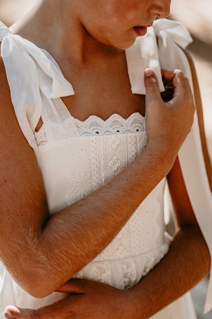 Robe au style rétro avec son col pierrot en voile de coton brodé. Le bas de la robe est composé d’un tulle brodé dont vous pouvez choisir sa hauteur pour les baptêmes traditionnel.
