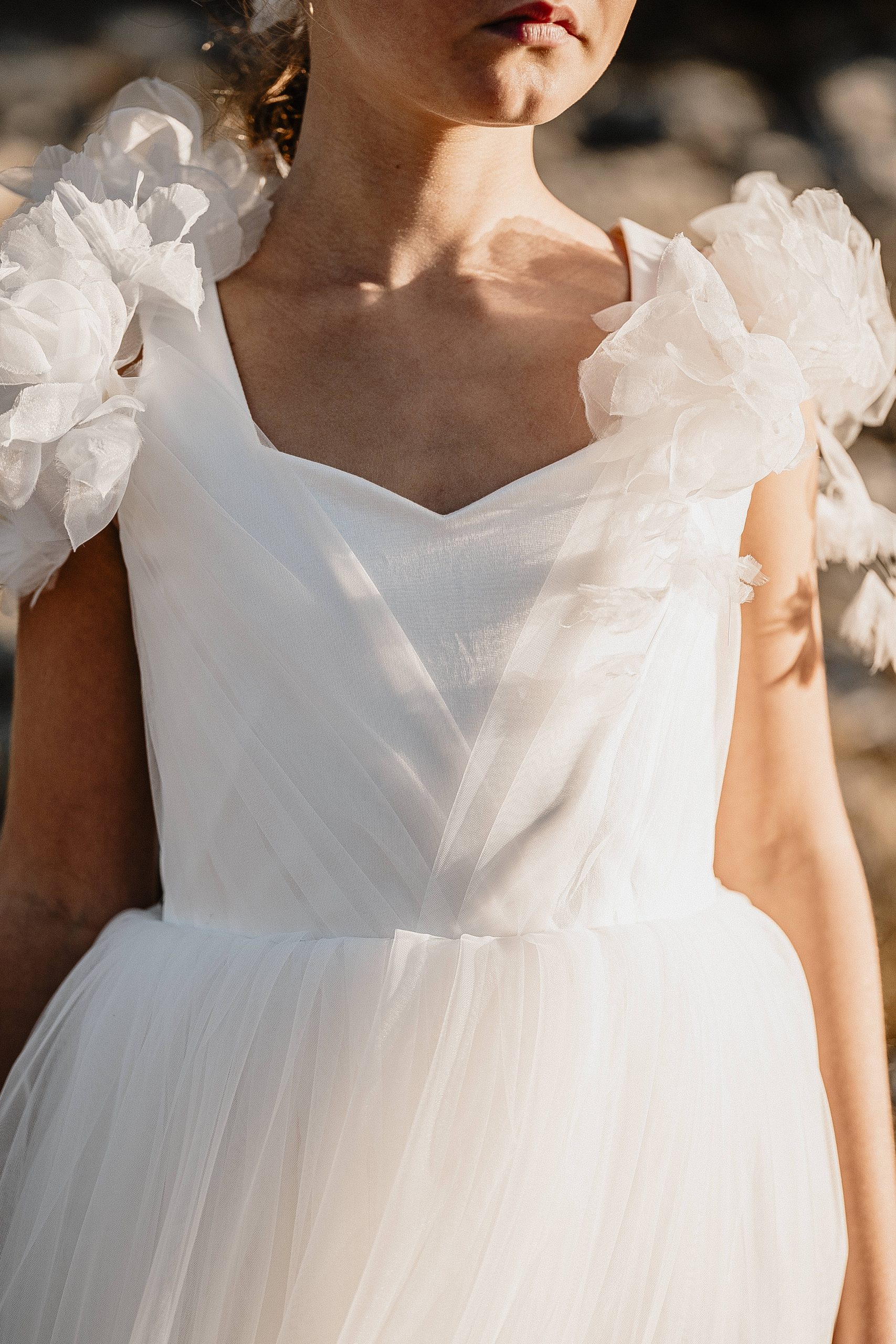 On adore ses bretelles ajustables sur les épaules en fleurs d’organza., son drapé en tulle sur le devant et son décolleté en cœur .