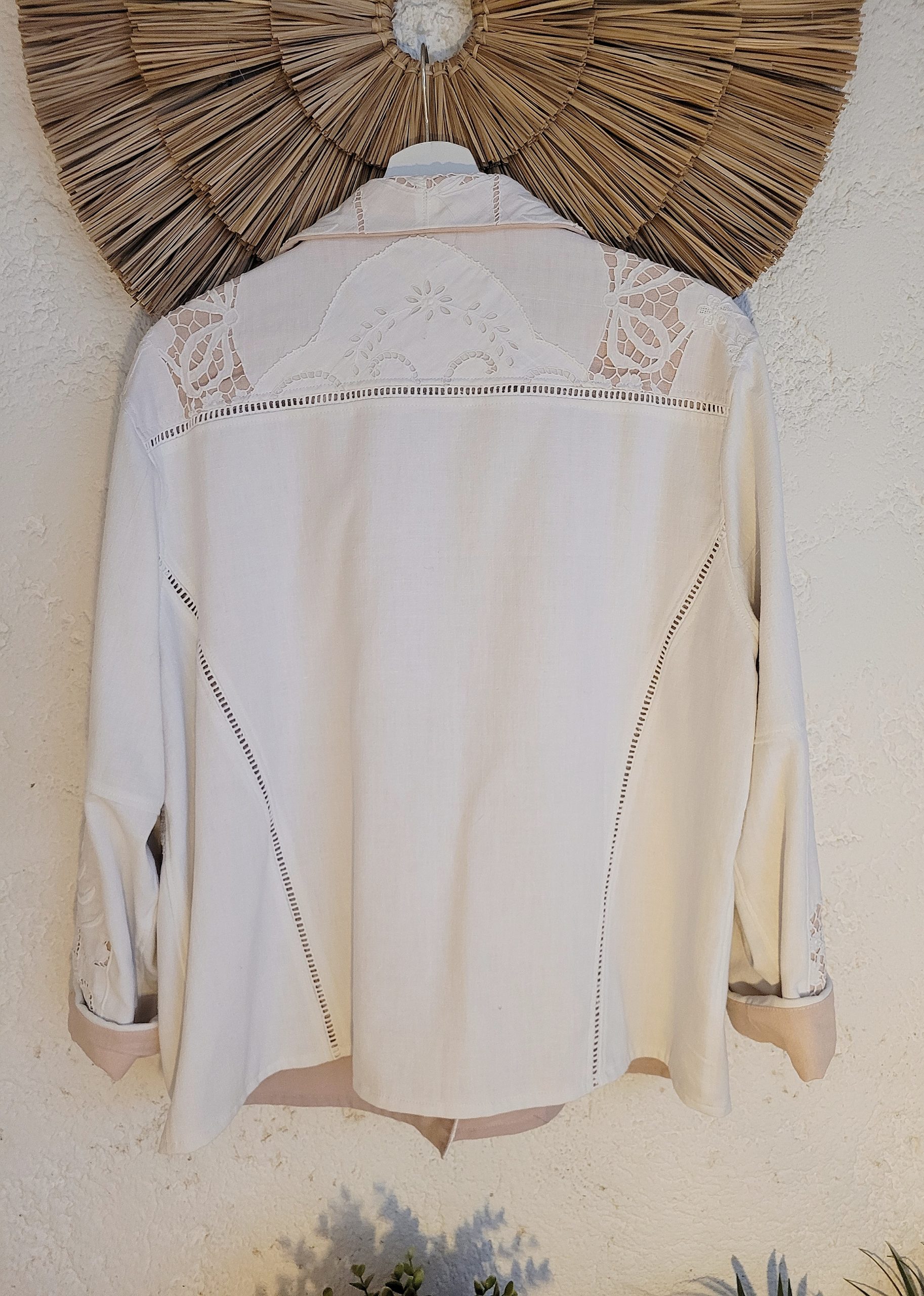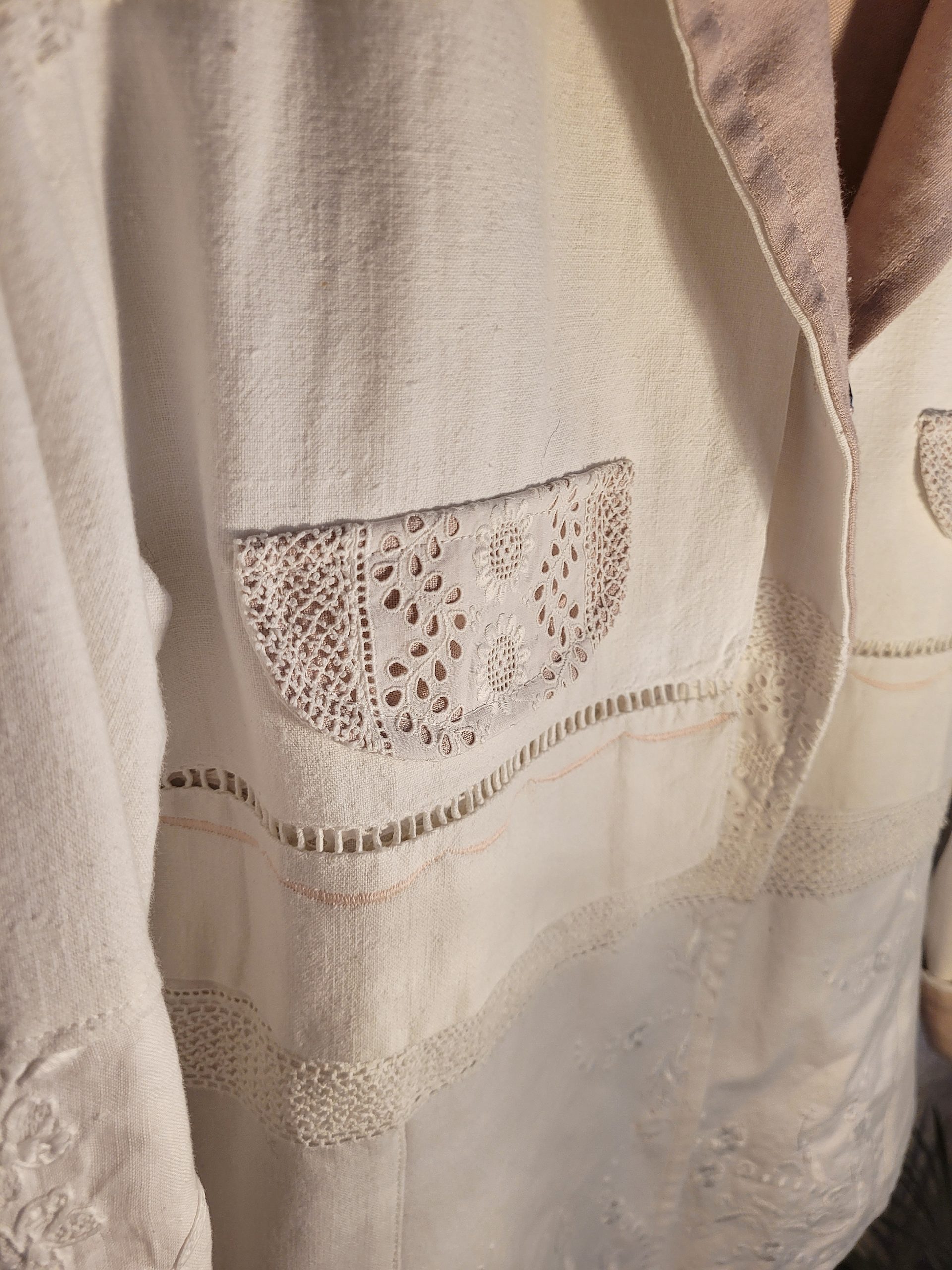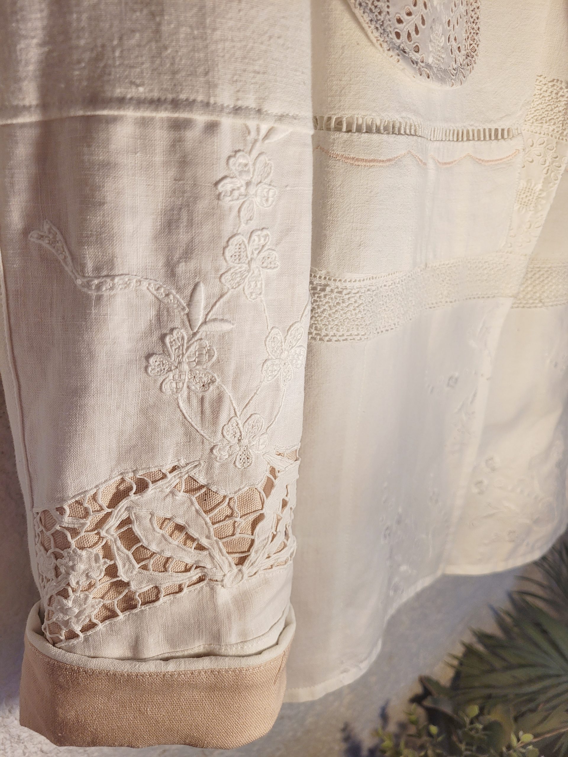 Incrustations de napperon brodé à la main et jeu de couleur avec sa doublure également en lin et coton rose.