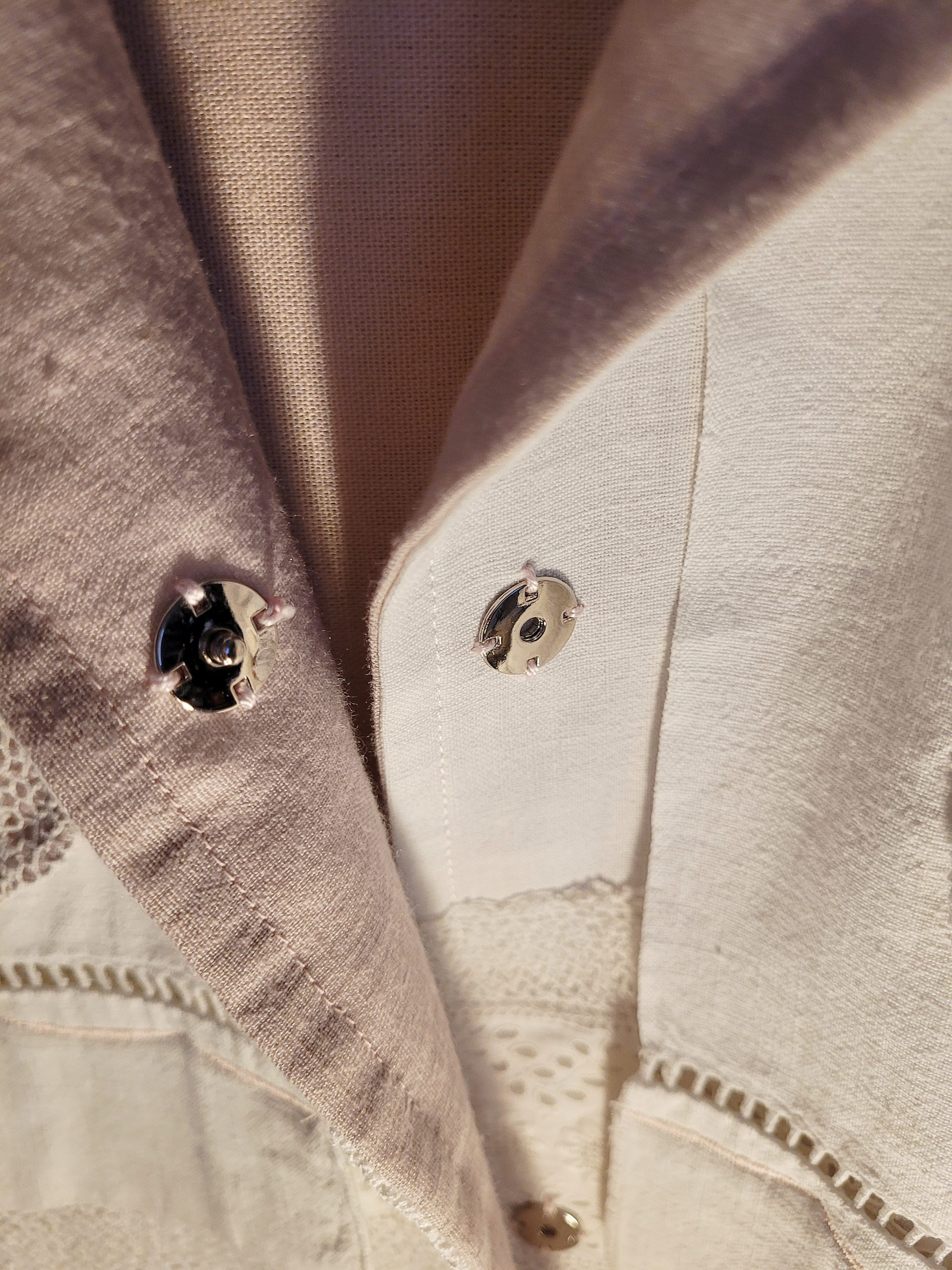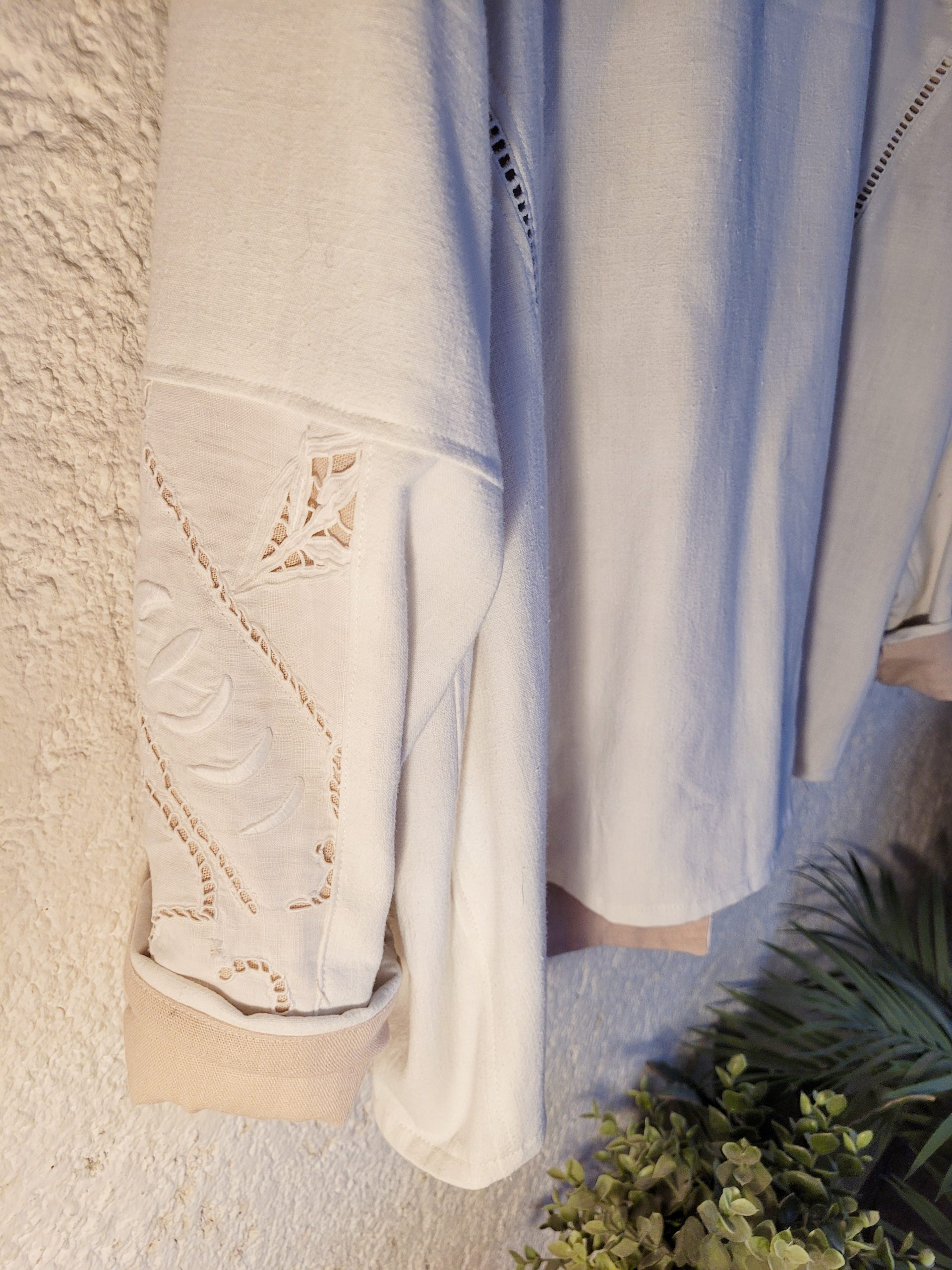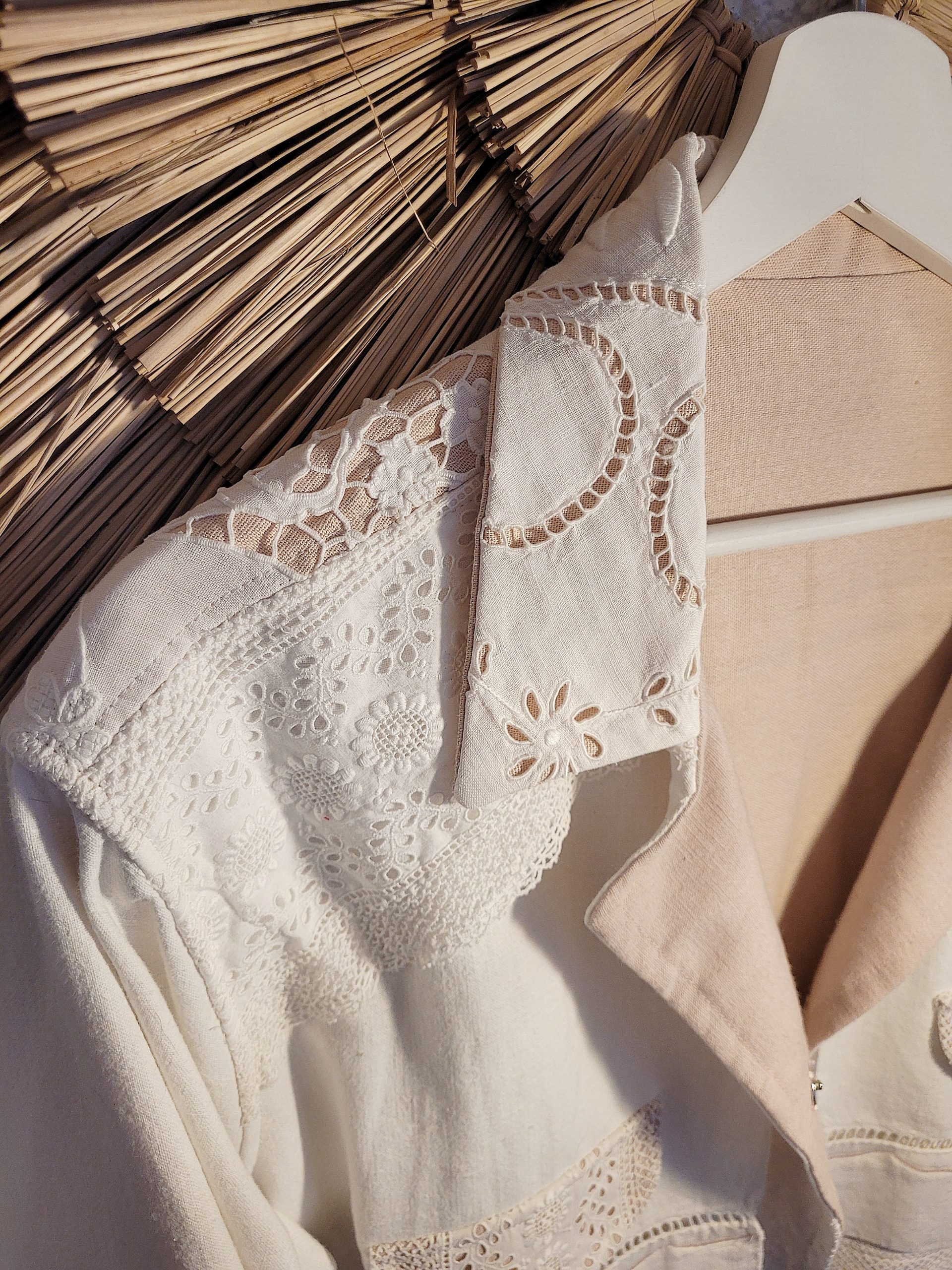 Incrustations de napperon brodé à la main et jeu de couleur avec sa doublure également en lin et coton rose.